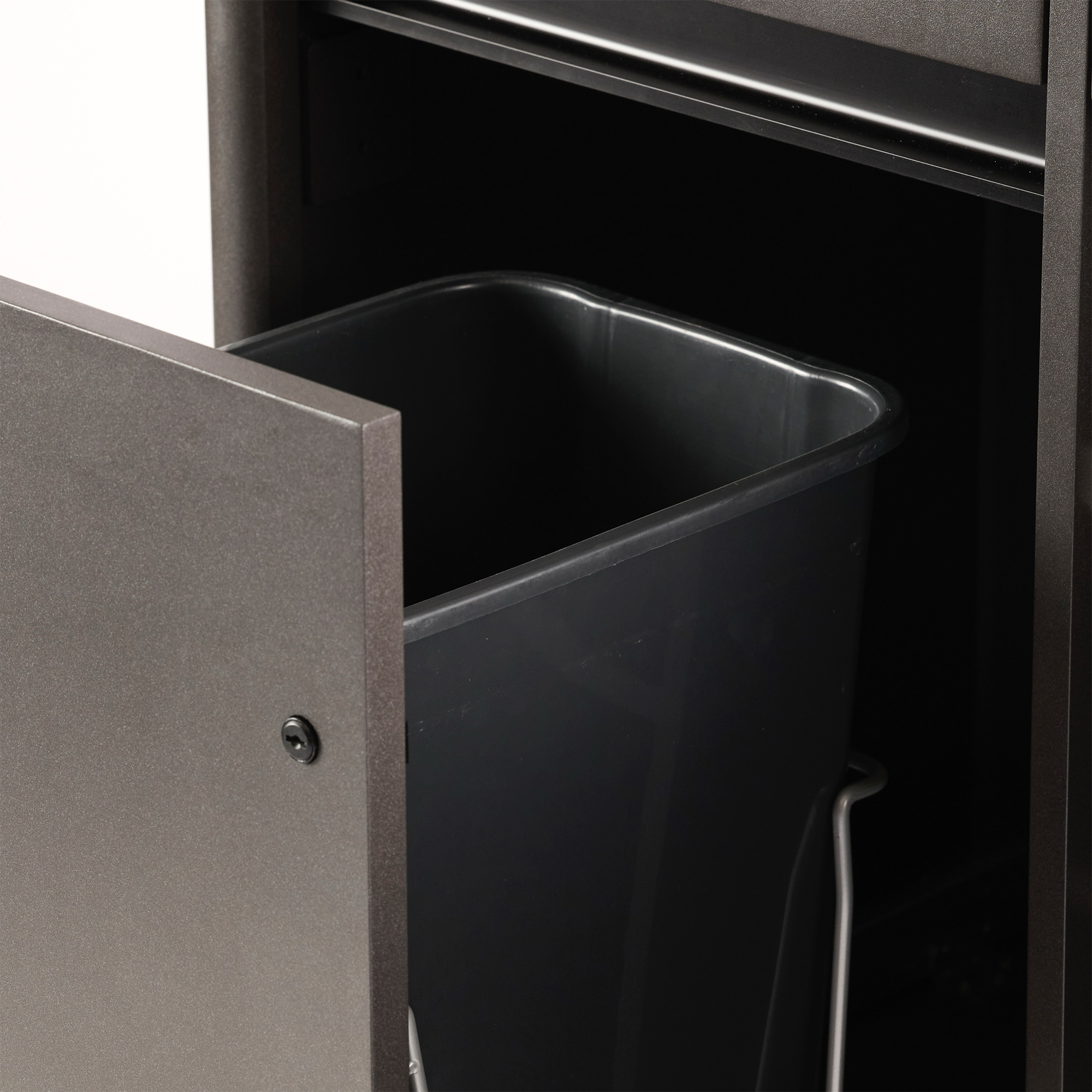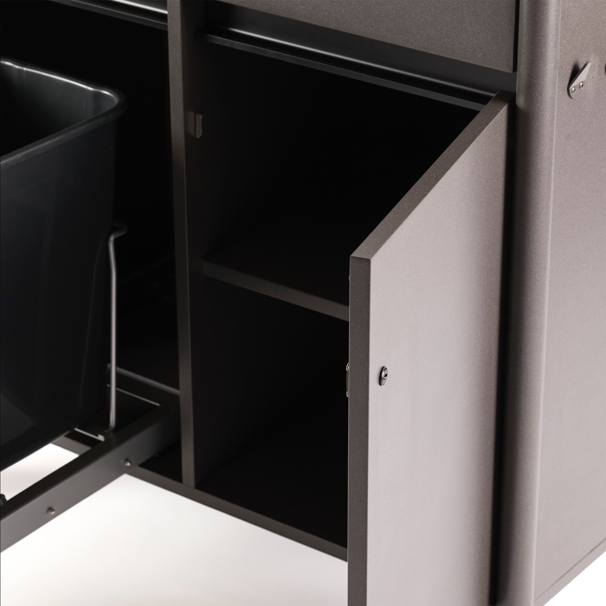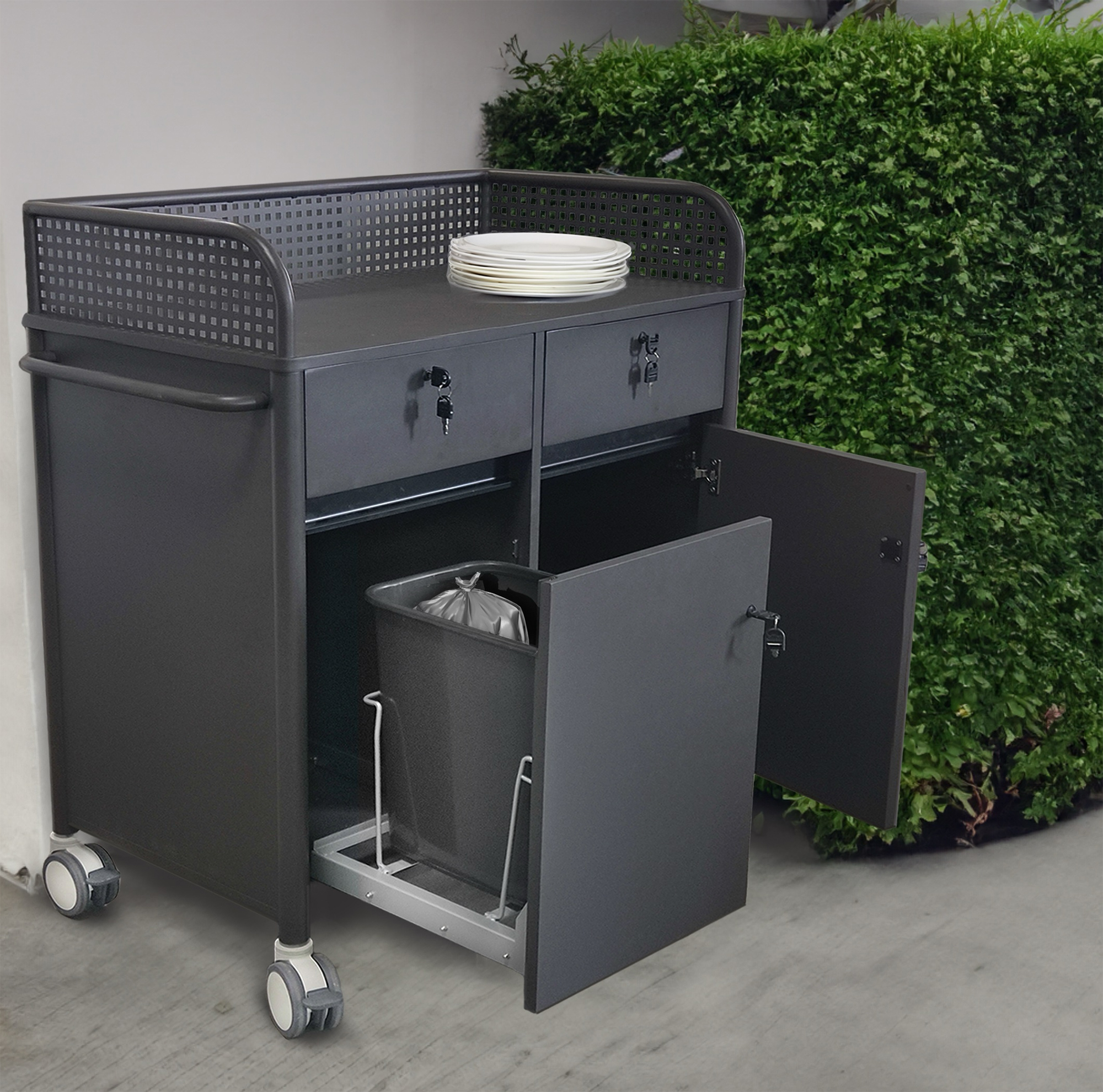 Tarjoilukärry pyörillä. Tilavat laatikot ja hyllyt. Liukuovi roskakorilla ja pyyhekoukuilla.
