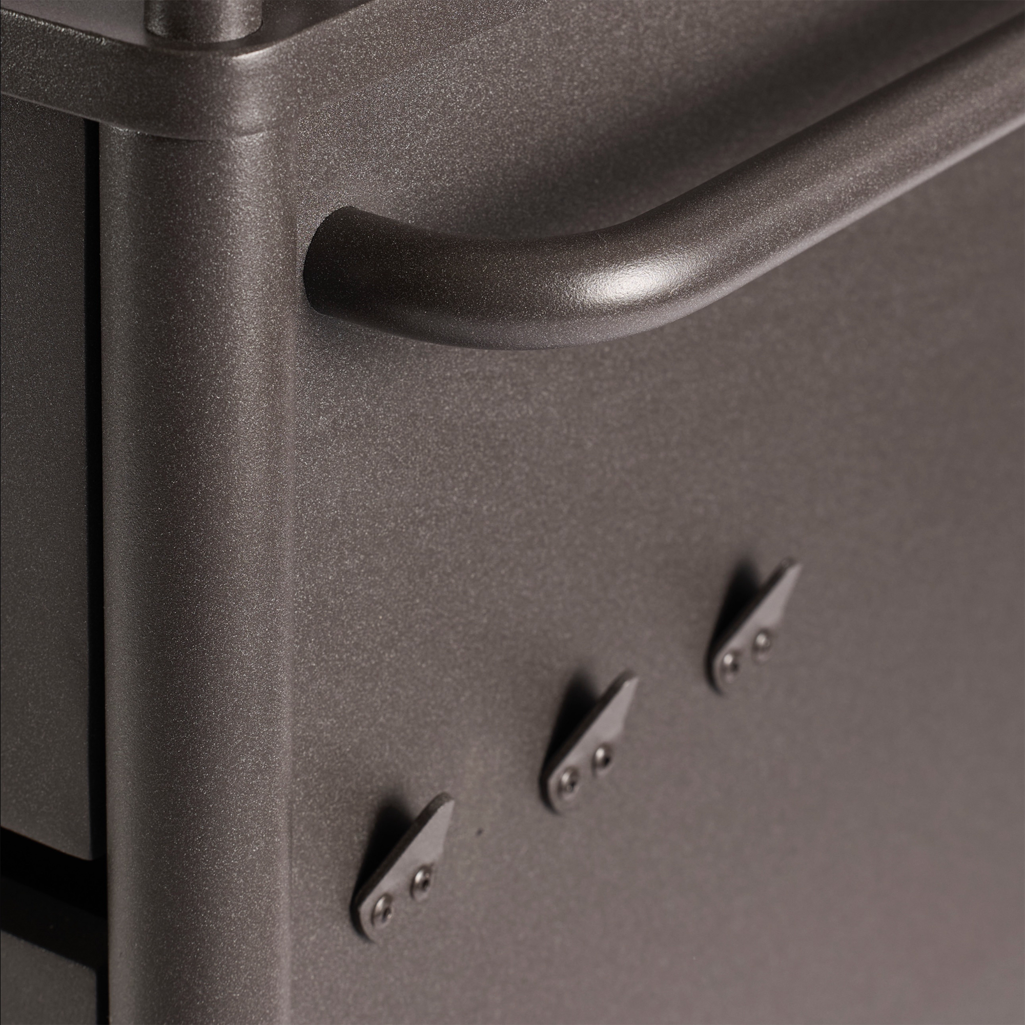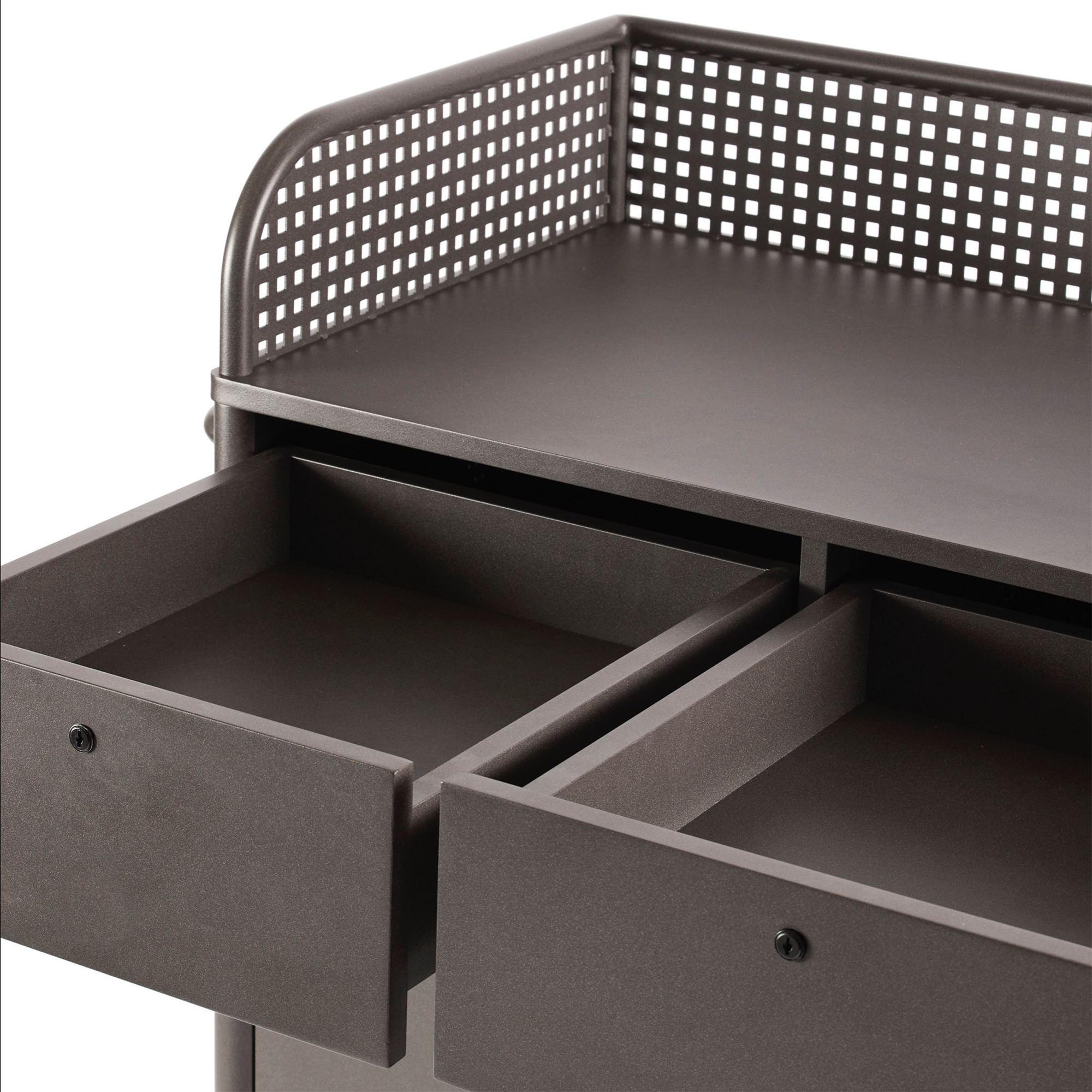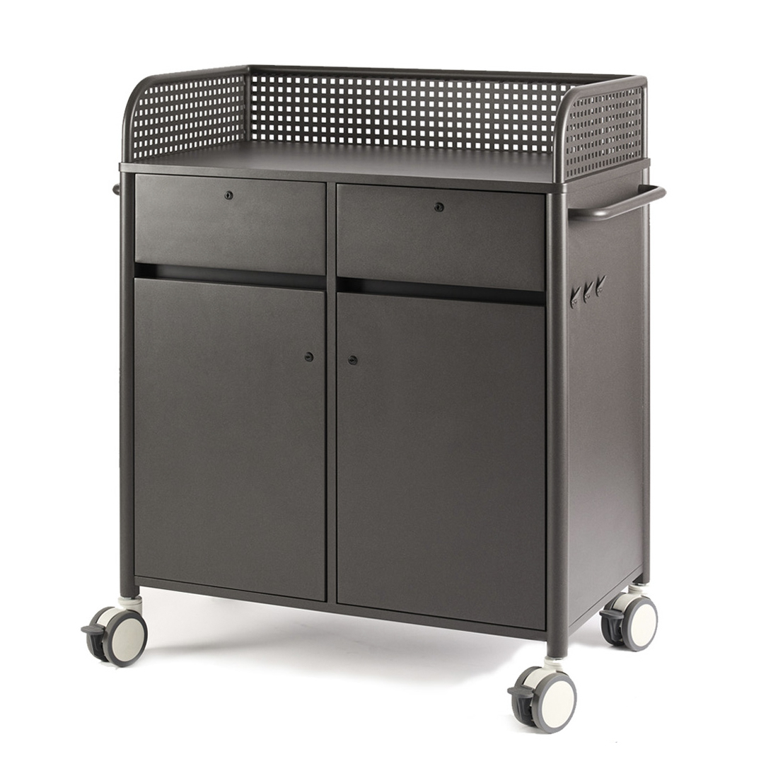 Tarjoilukärry pyörillä. Tilavat laatikot ja hyllyt. Liukuovi roskakorilla ja pyyhekoukuilla.